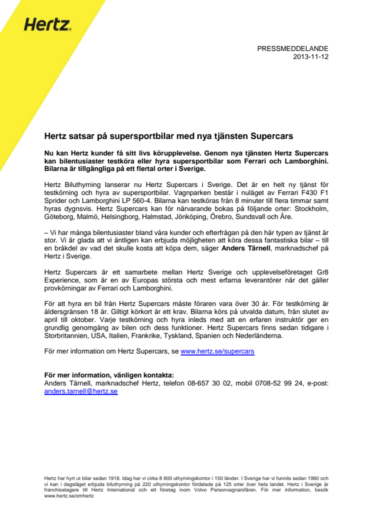 Nu kan Hertz kunder få sitt livs körupplevelse. Genom nya tjänsten Hertz Supercars kan bilentusiaster testköra eller hyra supersportbilar som Ferrari och Lamborghini. Bilarna är tillgängliga på ett flertal orter i Sverige.