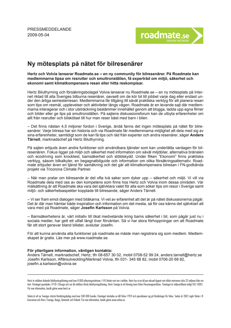 Hertz och Volvia lanserar Roadmate.se – en ny community för bilresenärer. På Roadmate kan medlemmarna tipsa om resrutter och smultronställen, få expertråd om miljö, säkerhet och ekonomi samt klimatkompensera resan eller hitta reskompisar.