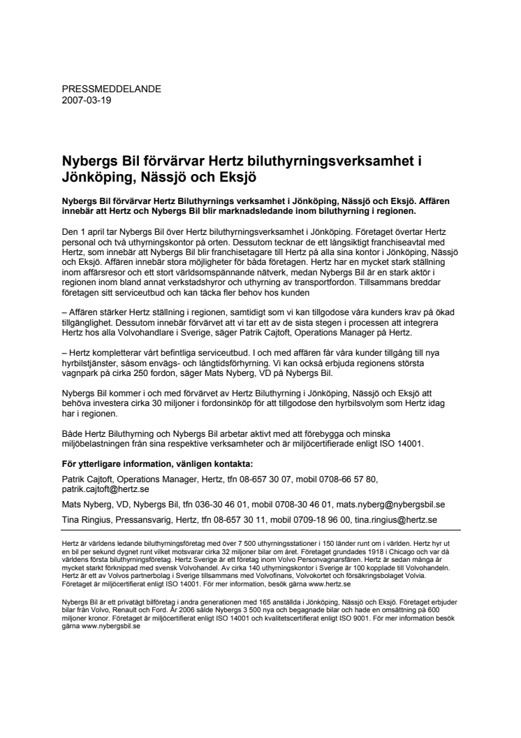 Nybergs Bil tar över Hertz Biluthyrnings verksamhet i Jönköping, Nässjö och Eksjö. Affären innebär att Hertz och Nybergs Bil blir marknadsledande inom biluthyrning i regionen.