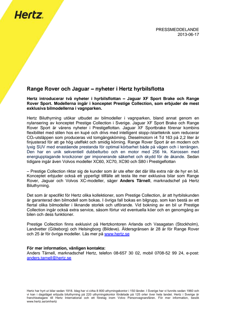 Hertz introducerar två nyheter i hyrbilsflottan – Jaguar XF Sport Brake och Range Rover Sport. Modellerna ingår i konceptet Prestige Collection, som erbjuder de mest exklusiva bilmodellerna i vagnparken.