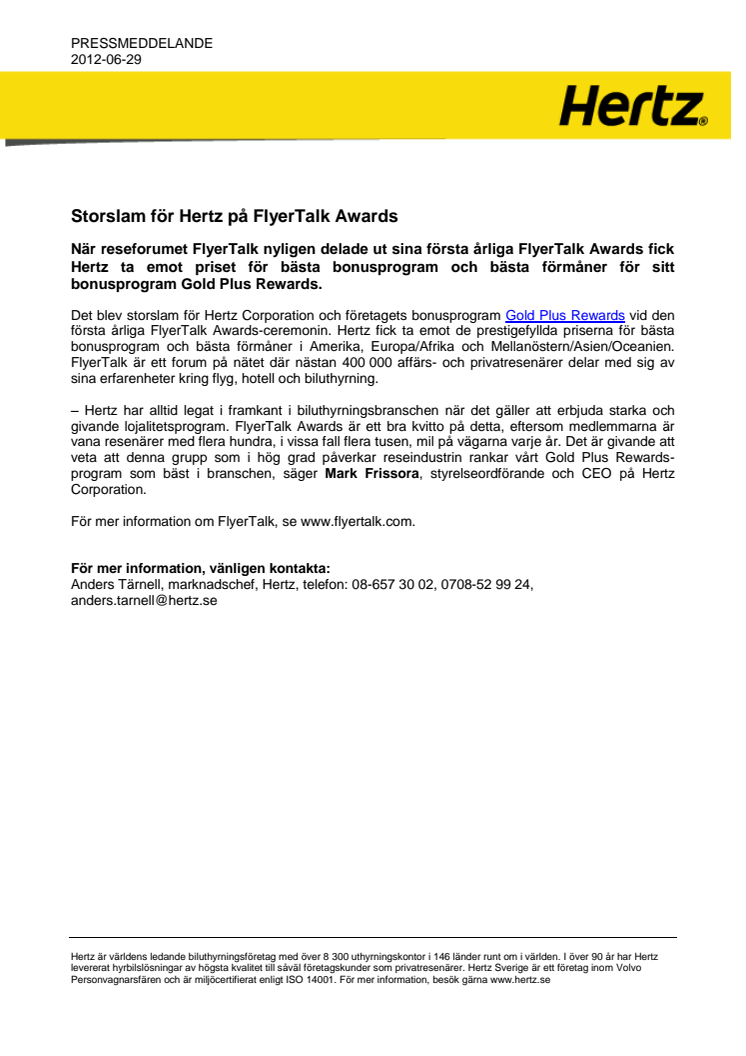 När reseforumet FlyerTalk nyligen delade ut sina första årliga FlyerTalk Awards fick Hertz ta emot priset för bästa bonusprogram och bästa förmåner för sitt bonusprogram Gold Plus Rewards.