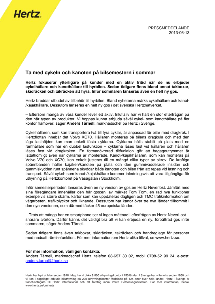 Hertz fokuserar ytterligare på kunder med en aktiv fritid när de nu erbjuder cykelhållare och kanothållare till hyrbilen. Sedan tidigare finns bland annat takboxar, skidräcken och takräcken att hyra. Inför sommaren lanseras även en helt ny gps.