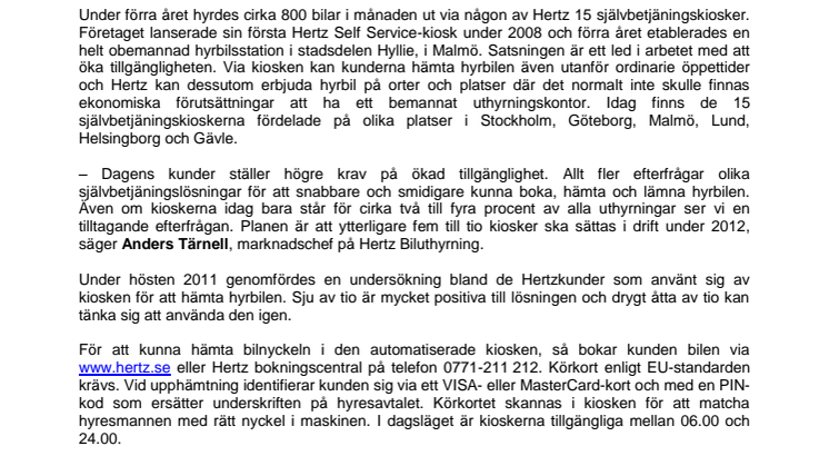 – Dagens kunder ställer högre krav på ökad tillgänglighet. Allt fler efterfrågar olika självbetjäningslösningar för att snabbare och smidigare kunna boka, hämta och lämna hyrbilen. Även om kioskerna idag bara står för cirka två till fyra procent av alla uthyrningar ser vi en tilltagande efterfrågan. Planen är att ytterligare fem till tio kiosker ska sättas i drift under 2012, säger Anders Tärnell, marknadschef på Hertz Biluthyrning.