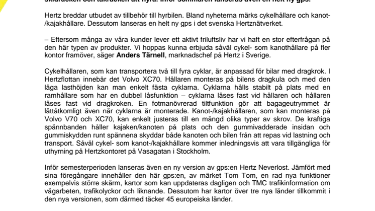 Hertz fokuserar ytterligare på kunder med en aktiv fritid när de nu erbjuder cykelhållare och kanothållare till hyrbilen. Sedan tidigare finns bland annat takboxar, skidräcken och takräcken att hyra. Inför sommaren lanseras även en helt ny gps.