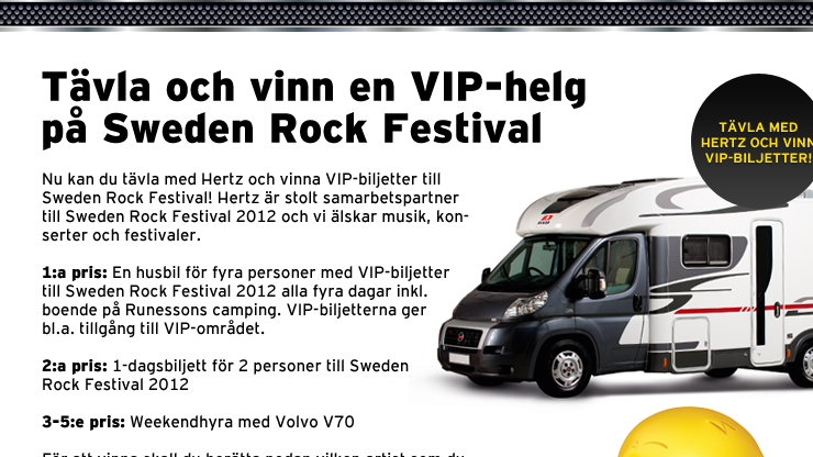 Inför Sweden Rock Festival 2012 utlyser Hertz en tävling på sin Facebook-sida. Förstapriset är VIP-biljetter och en husbil, inklusive campingplats, under hela festivalen.