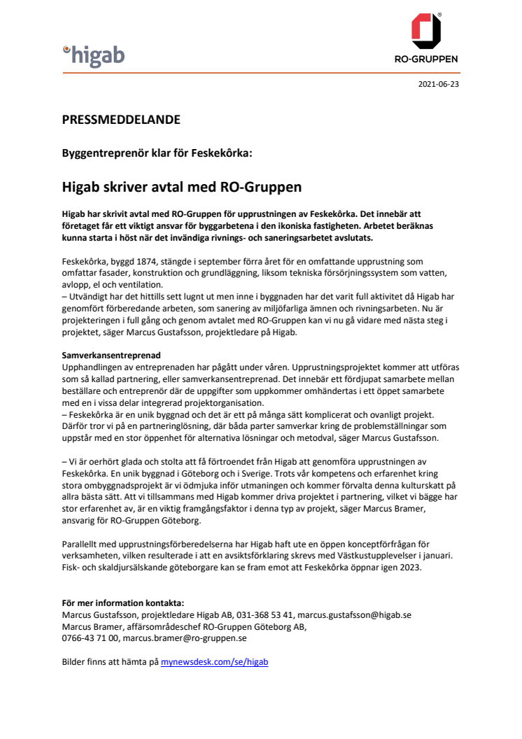 Higab har skrivit avtal med RO-Gruppen för upprustningen av Feskekôrka. Det innebär att företaget får ett viktigt ansvar för byggarbetena i den ikoniska fastigheten. Arbetet beräknas kunna starta i höst när det invändiga rivnings- och saneringsarbetet avslutats.