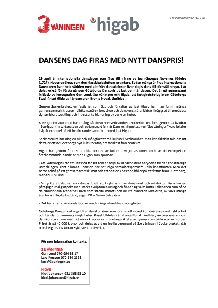 Fastighetsbolaget Higab och Gun Lund, koreograf på 3:e Våningen instiftar gemensamt ett nytt pris för dansare i Göteborg. Priset tilldelas i år Bronja Novak Lindblad och delas ut vid en festlig ceremoni på Dansens dag den 29 april, på 3:e Våningen, Sockerbruket, Göteborg.