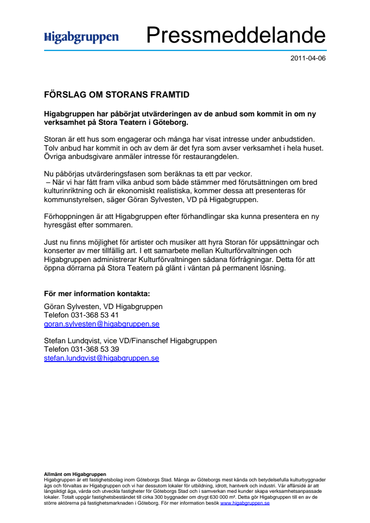 Stora Teatern i Göteborg är ett hus som engagerar och många har idéer om vad den kan användas till. Nu har Higabgruppen påbörjat utvärderingen av de anbud som kommit in om ny verksamhet på Storan.