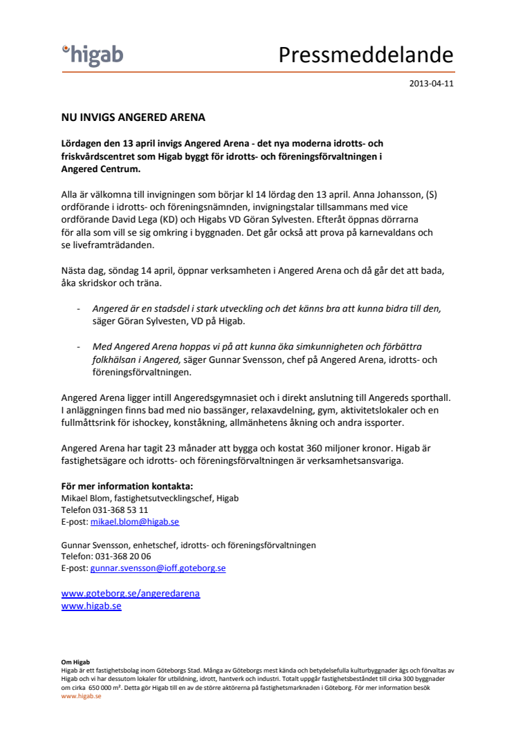 Lördagen den 13 april invigs Angered Arena - det nya moderna idrotts- och friskvårdscentret som Higab byggt för idrotts- och föreningsförvaltningen i Angered Centrum. Anna Johansson, (S) ordförande i idrotts- och föreningsnämnden, invigningstalar tillsammans med vice ordförande David Lega (KD) och Higabs VD Göran Sylvesten. Efteråt öppnas dörrarna för alla som vill se sig omkring i byggnaden.