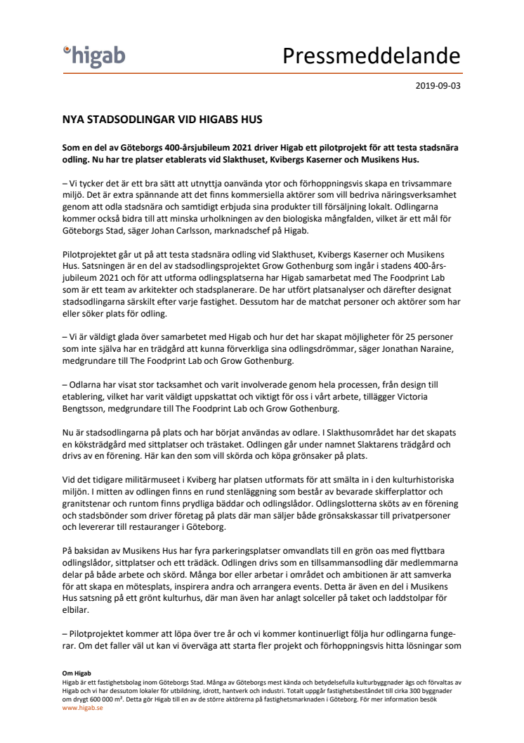 Som en del av Göteborgs 400-årsjubileum 2021 driver Higab ett pilotprojekt för att testa stadsnära odling. Nu har tre platser etablerats vid Slakthuset, Kvibergs Kaserner och Musikens Hus.
