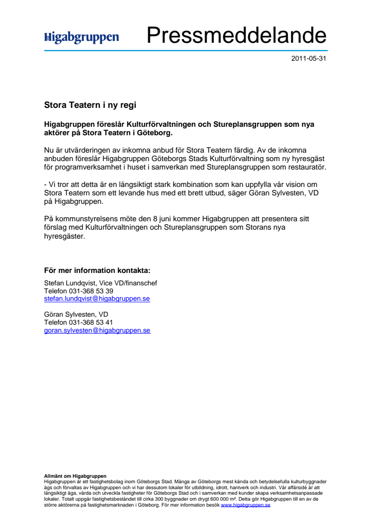 Higabgruppen föreslår Kulturförvaltningen och Stureplansgruppen som nya aktörer på Stora Teatern i Göteborg.