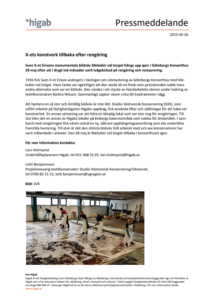Sven X-et Erixons monumentala bildväv Melodier vid torget hängs upp igen i Göteborgs Konserthus 28 maj efter att i drygt två månader varit ivägskickad på rengöring och restaurering.