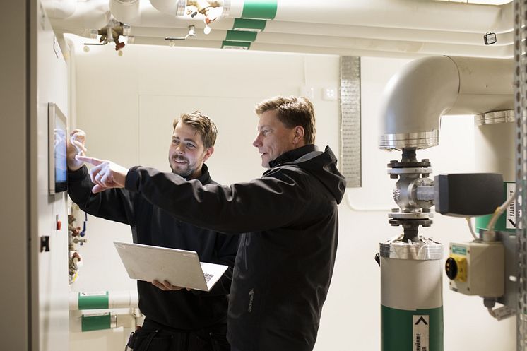 Drifttekniker Niklas Johansson och driftchef Robert Schwartze arbetar med Hotell Hedens energisystem.jpg