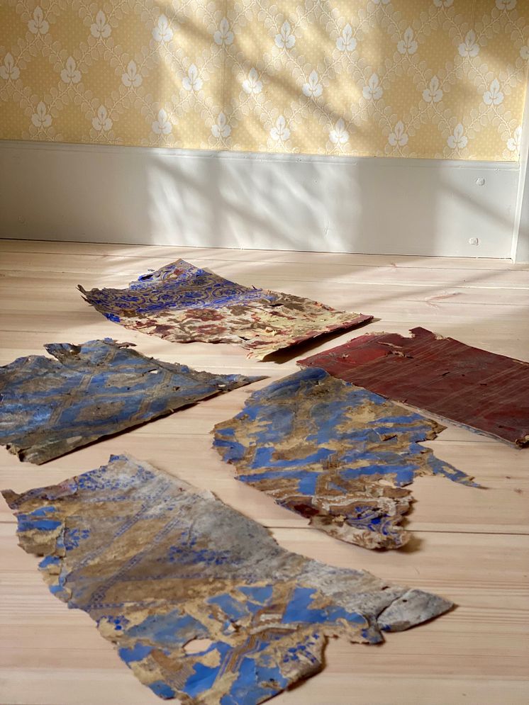 De tidigaste ytskikten i huset bestod av en bemålad lerkilning från 1700-talet, som senare har tapetserats. Under renoveringen har upp till tio lager tapeter identifierats, varav de äldsta bedöms härröra från perioden 1820–1840. I rummet beläget innanför köket har delar av tapeterna demonterats, dokumenterats och sedan återplacerats i väggen för att bevaras för framtiden. Här syns några av de gamla tapetresterna.
