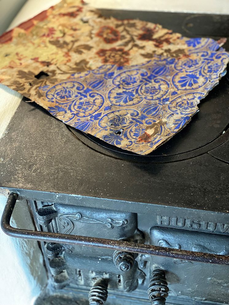 Några av de upphittade tapetresterna från 1800-talet ligger på husets vedspis.
