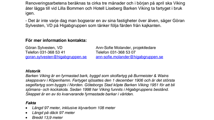 Renoveringsarbetena beräknas ta cirka tre månader och i början på april ska Viking åter lägga till vid Lilla Bommen och Hotell Liseberg Barken Viking ta fartyget i bruk igen.
