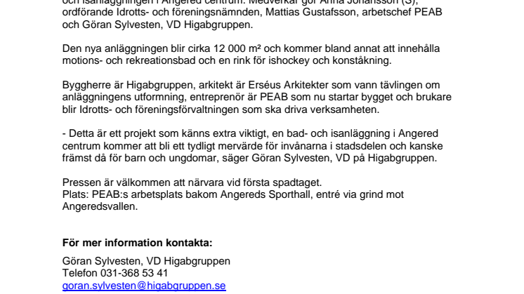 På onsdag den 30 mars kl 11.30 tas första spadtaget på bygget av den nya bad- och isanläggningen i Angered centrum. Medverkar gör Anna Johansson (S), ordförande Idrotts- och föreningsnämnden, Mattias Gustafsson, arbetschef PEAB och Göran Sylvesten, VD Higabgruppen.