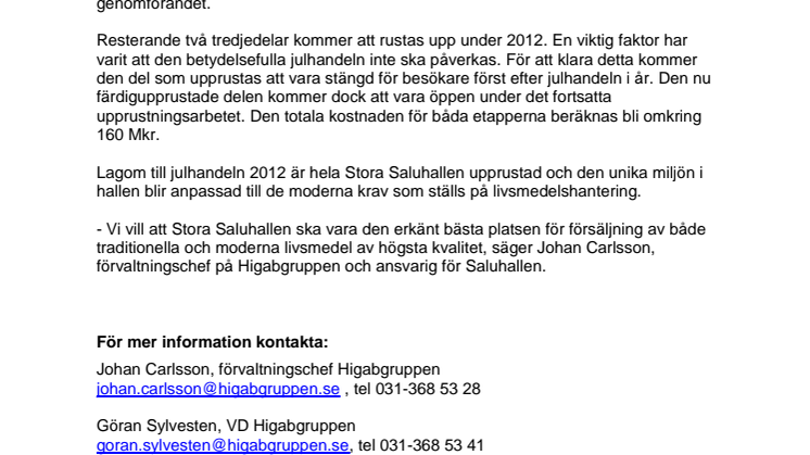 Lagom till julhandeln 2012 är hela Stora Saluhallen upprustad och den unika miljön i hallen blir anpassad till de moderna krav som ställs på livsmedelshantering.