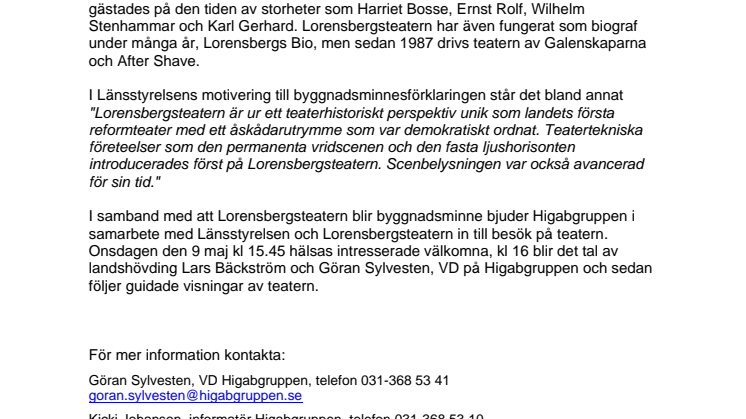I samband med att Lorensbergsteatern blir byggnadsminne bjuder Higabgruppen i samarbete med Länsstyrelsen och Lorensbergsteatern in till besök på teatern. Onsdagen den 9 maj kl 15.45 hälsas intresserade välkomna, kl 16 blir det tal av landshövding Lars Bäckström och Göran Sylvesten, VD på Higabgruppen och sedan följer guidade visningar av teatern.