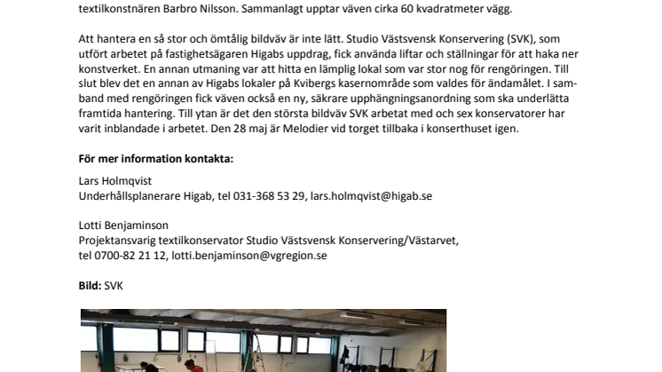Att hantera en så stor och ömtålig bildväv är inte lätt. Studio Västsvensk Konservering (SVK), som utfört arbetet på fastighetsägaren Higabs uppdrag, fick använda liftar och ställningar för att haka ner konstverket. En annan utmaning var att hitta en lämplig lokal som var stor nog för rengöringen. Till slut blev det en annan av Higabs lokaler på Kvibergs kasernområde som valdes för ändamålet. I samband med rengöringen fick väven också en ny, säkrare upphängningsanordning som ska underlätta framtida hantering. Till ytan är det den största bildväv SVK arbetat med och sex konservatorer har varit inblandade i arbetet. Den 28 maj är Melodier vid torget tillbaka i konserthuset igen.