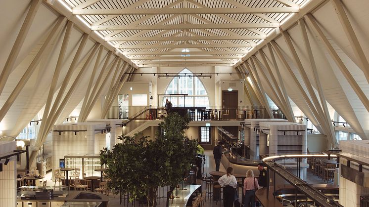 Att få in moderna verksamheter som kräver uppdaterad teknik i ett 150-årigt byggnadsminne är inte det lättaste. I Feskekôrka göms nutida tekniklösningar finurligt under mark och i kaklade ”hubbar” som samspelar med den klassiska interiören.