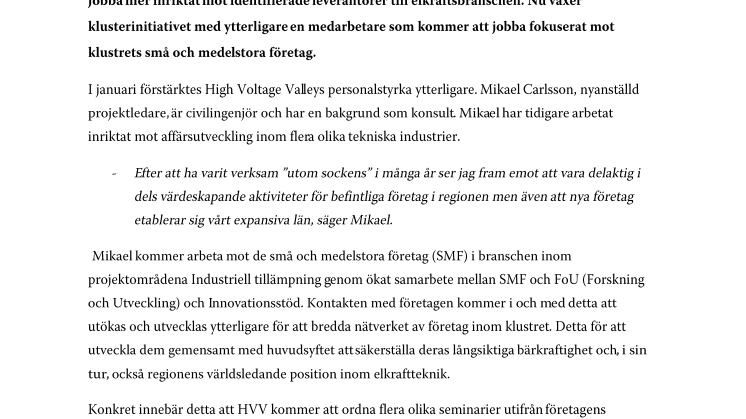 I januari förstärktes High Voltage Valleys personalstyrka ytterligare. Mikael Carlsson, nyanställd projektledare, är civilingenjör och har en bakgrund som konsult. Mikael har tidigare arbetat inriktat mot affärsutveckling inom flera olika tekniska industrier.