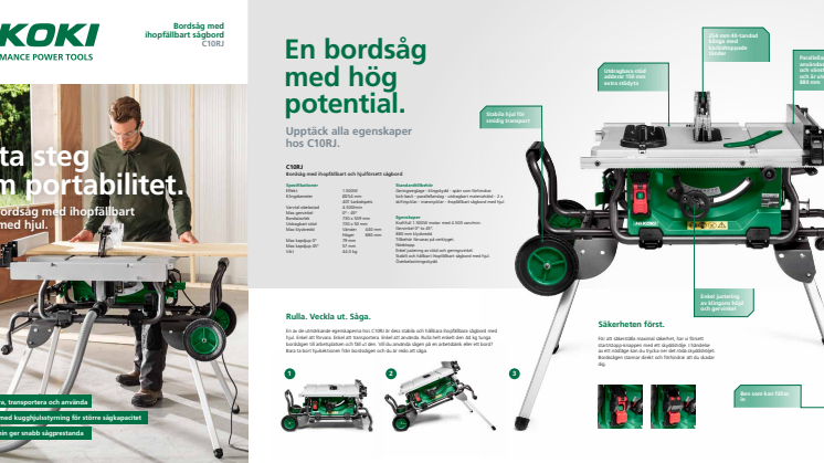 Den nätdrivna bordsågen C10RJ har motorbroms som stannar motorn tre sekunder efter att sågen stängts av. Den inbyggda mjukstarten säkerställer en smidig start samtidigt som ljudet minskas. Med enkel justering för att ställa in klingans höjd och gervinkel. Den kraftfulla motorn på 1500 watt, gör det möjligt att bearbeta även ek och annat kompakt virke snabbt och exakt. Sågen är enkel att transportera och förvara då ben och hjul är fällbara. Sågbord med hjul medföljer C10RJ.