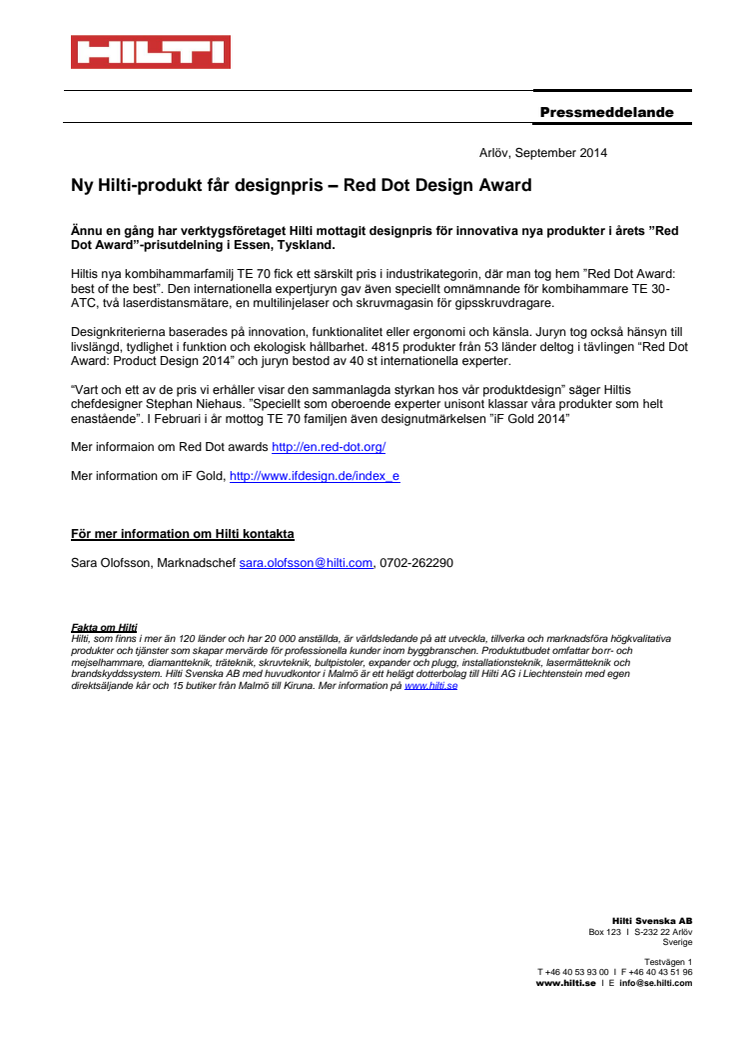 Ännu en gång har verktygsföretaget Hilti mottagit designpris för innovativa nya produkter i årets ”Red Dot Award”-prisutdelning i Essen, Tyskland.