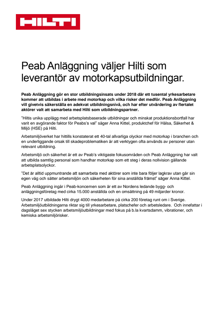 Peab Anläggning gör en stor utbildningsinsats under 2018 där ett tusental yrkesarbetare kommer att utbildas i arbete med motorkap och vilka risker det medför. Peab Anläggning vill givetvis säkerställa en adekvat utbildningsnivå, och har efter utvärdering av flertalet aktörer valt att samarbeta med Hilti som utbildningspartner.