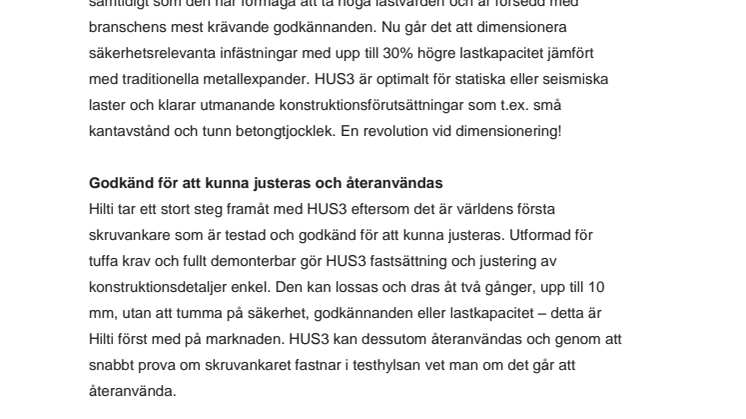 Hiltis nya skruvankare HUS3 öppnar för en helt ny flexibilitet vid dimensionering samtidigt som den har förmåga att ta höga lastvärden och är försedd med branschens mest krävande godkännanden. Nu går det att dimensionera säkerhetsrelevanta infästningar med upp till 30% högre lastkapacitet jämfört med traditionella metallexpander. HUS3 är optimalt för statiska eller seismiska laster och klarar utmanande konstruktionsförutsättningar som t.ex. små kantavstånd och tunn betongtjocklek. En revolution vid dimensionering!