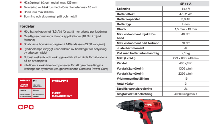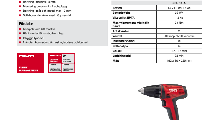 Hilti lanserar nu en helt ny 14-voltsplattform som bygger på ny teknik. Den kommer med två batterivarianter, ett lättare kompaktbatteri och ett standardbatteri med högsta kapacitet, båda passar i samma laddare. Plattformen innehåller fem nya verktyg och en stark lysdiodlampa. Alla ingående delar har så kallat Lifetime Service vilket innebär två kostnadsfria år samt därefter livstids tillverkningsgaranti och kostnadstak på reparationer.