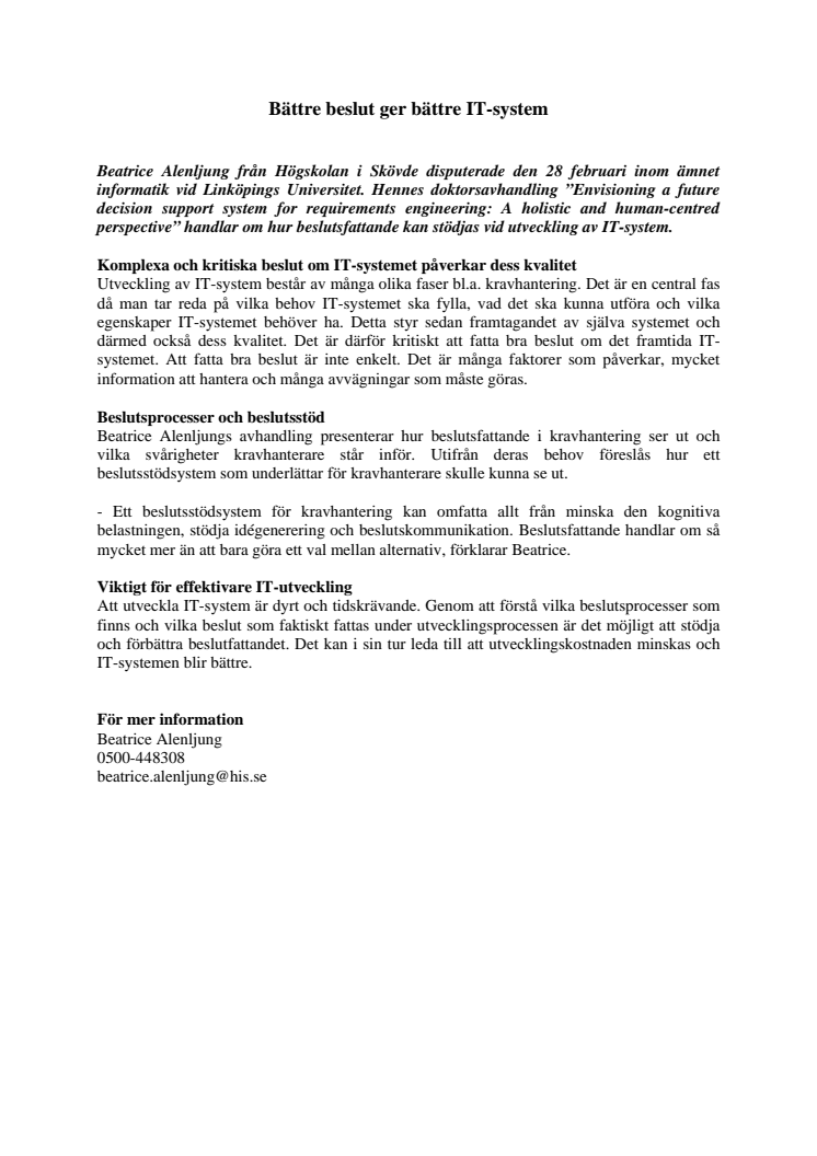 Beatrice Alenljung från Högskolan i Skövde disputerade den 28 februari inom ämnet informatik vid Linköpings Universitet. Hennes doktorsavhandling ”Envisioning a future decision support system for requirements engineering: A holistic and human-centred perspective” handlar om hur beslutsfattande kan stödjas vid utveckling av IT-system.