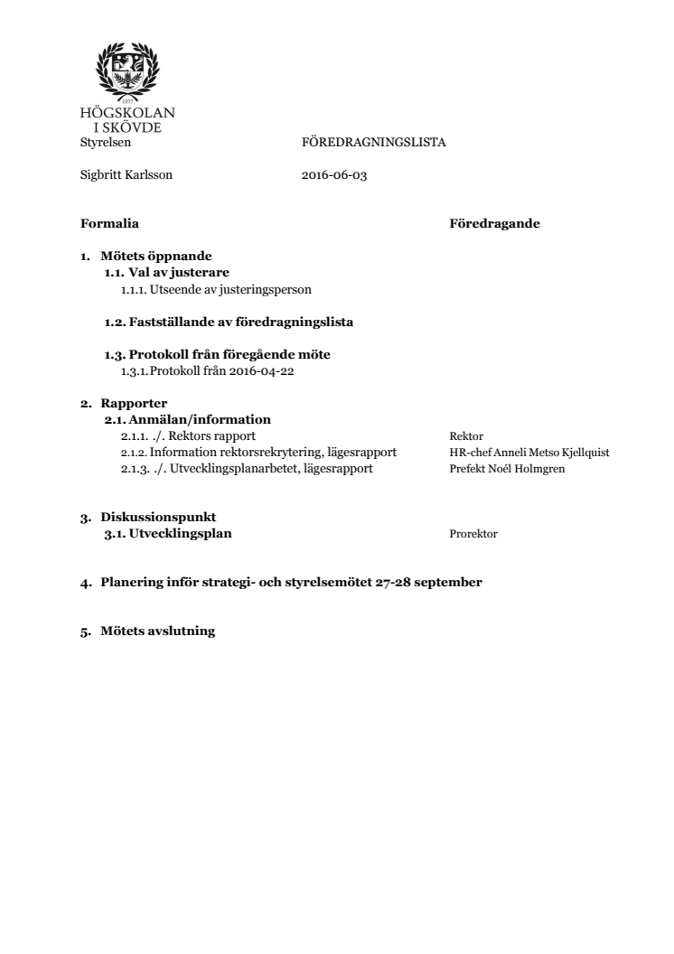 Föredragningslista för styrelsemöte 3 juni 2016