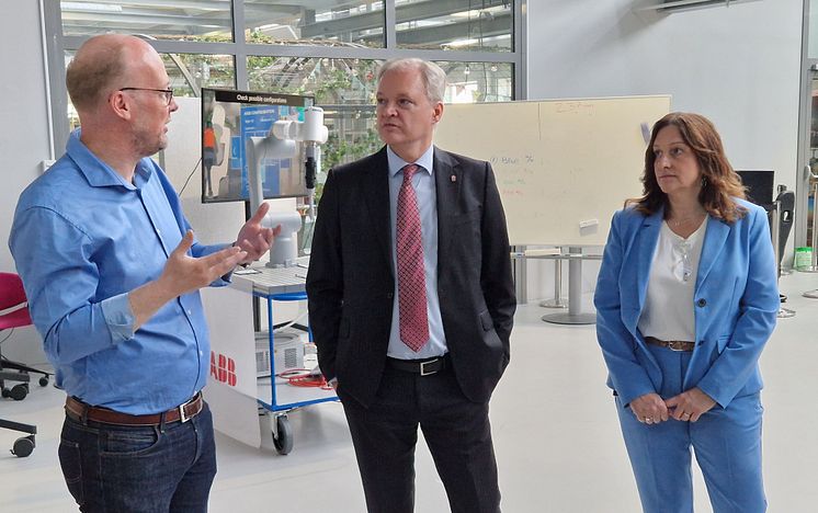 Magnus Holm, lektor i automatiseringsteknik, tar emot landshövdingen Sten Tolgfors och Högskolans rektor Muriel Beser Hugosson på ASSAR Industrial Innovation Arena.