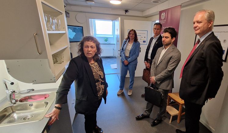 Catharina Gillsjö, biträdande professor i omvårdnad, guidar landshövding Sten Tolgfors genom Skaraborgs Hälsoteknikcentrum.