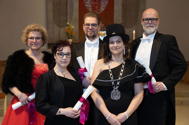 Rekor Muriel Beser Hugosson med professorerna Jane Synnergren, Sakari Kallio, Kent Salomonsson och Katja Valli. Akademisk högtid 2023.