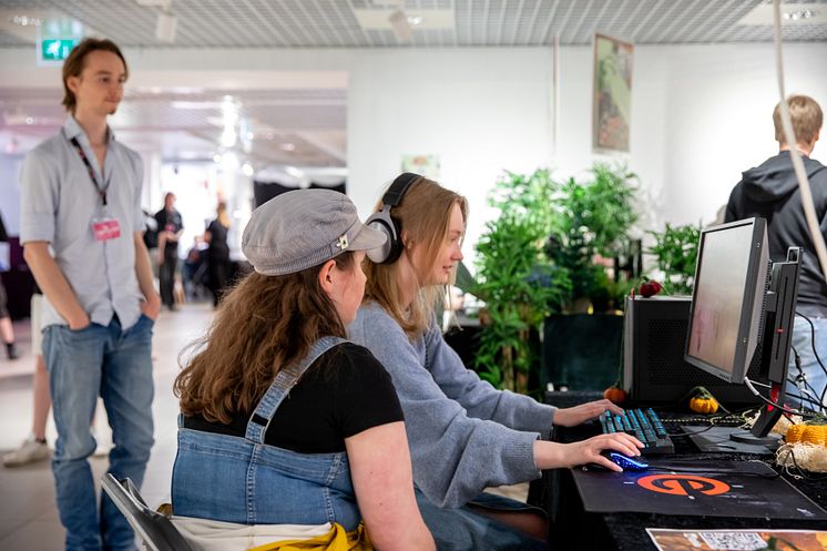 Bild på två tjejer som spelar ett spel under spelmässan på Commerce 2024.