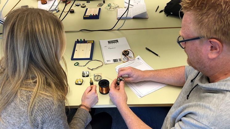 Tillbaka till labbsalen. Studenterna från Volvo har tidigare konstruerat en likströmsmotor, nu ska de istället ta sig an uppgiften att tillverka en liten växelströmsmotor. Anders Ericsson och Martina Axén som båda jobbar på Volvo lastvagnar är i full gång med att bygga den lilla modellen. På bordet framför dem finns ritningar, koppartråd, kompass och en mängd andra tillbehör för att kunna utföra dagens praktiska uppgifter.