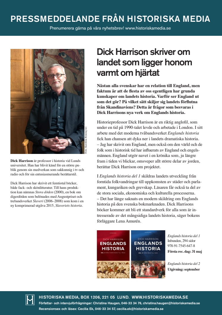 Nästan alla svenskar har en relation till England, men faktum är att de flesta av oss egentligen har grunda kunskaper om landets historia. Varför ser England ut som det gör? På vilket sätt skiljer sig landets förflutna från Skandinaviens? Detta är frågor som besvaras i Dick Harrisons nya verk om Englands historia.
