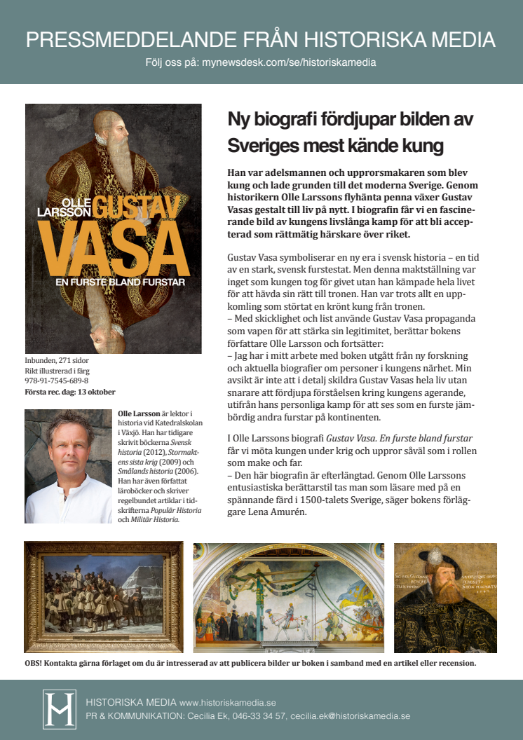 Han var adelsmannen och upprorsmakaren som blev kung och lade grunden till det moderna Sverige. Genom historikern Olle Larssons flyhänta penna växer Gustav Vasas gestalt till liv på nytt. I biografin får vi en fascinerande bild av kungens livslånga kamp för att bli accepterad som rättmätig härskare över riket.