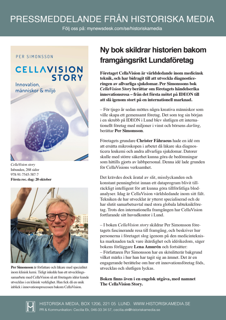 Företaget CellaVision är världsledande inom medicinsk teknik, och har bidragit till att utveckla diagnosticeringen av allvarliga sjukdomar. Per Simonssons bok CellaVision Story berättar om företagets händelserika innovationsresa – från det första mötet på IDEON till att slå igenom stort på en internationell marknad.