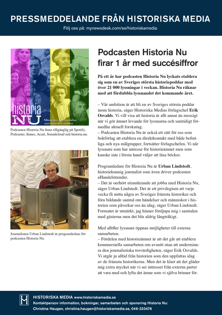 På ett år har podcasten Historia Nu lyckats etablera sig som en av Sveriges största historiepoddar med över 21 000 lyssningar i veckan. Historia Nu räknar med att fördubbla lyssnandet det kommande året.