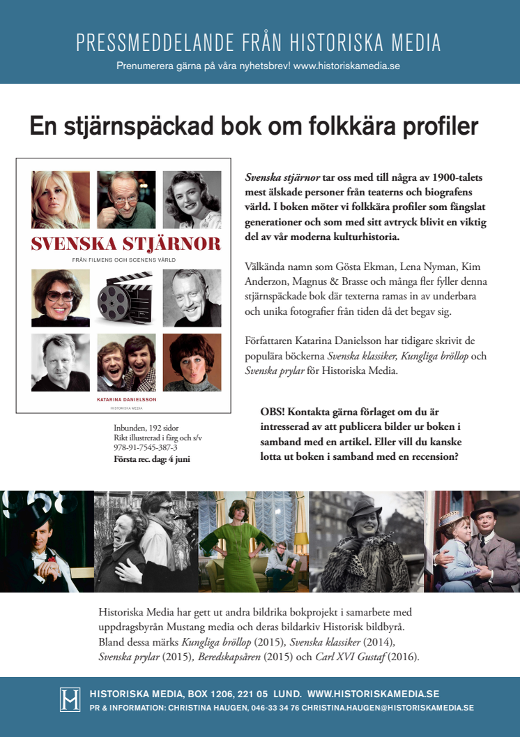 Svenska stjärnor tar oss med till några av 1900-talets mest älskade personer från teaterns och biografens värld. I boken möter vi folkkära profiler som fängslat generationer och som med sitt avtryck blivit en viktig del av vår moderna kulturhistoria.