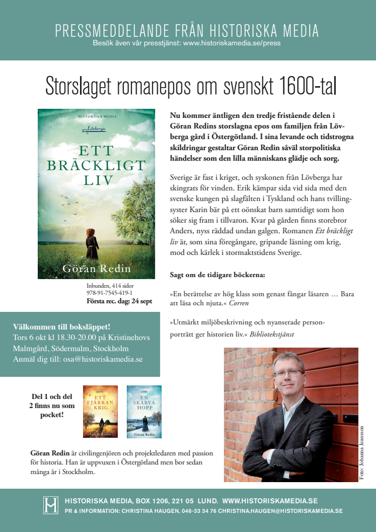 Nu kommer äntligen den tredje fristående delen i Göran Redins storslagna epos om familjen från Lövberga gård i Östergötland. I sina levande och tidstrogna skildringar gestaltar författaren både storpolitiska ändelser och den lilla människans glädje och sorg.