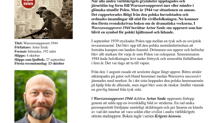 När alla andra världskrigets grymheter uppdagades och järnridån tog form föll Warszawaupproret mer eller mindre i glömska utanför Polen. Men år 1944 var situationen en annan. Det rapporterades flitigt från den polska huvudstaden och ordnades insamlingar till stöd för civilbefolkningen. Nu kommer den första svenskskrivna boken om de dramatiska veckorna. I Warszawaupproret 1944 berättar Artur Szulc om upproret som har blivit en symbol för polskt hjältemod och lidande.