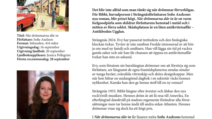 I När drömmarna slår in får läsaren möta Sofie Axelzons hemstad Strängnäs både i nutid och som den såg ut på femtio- och sextiotalen. Det är en varm berättelse om hur drömmar kan förverkligas och krossas. Kanske vet vi inte alltid vad vi önskar ...