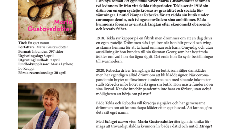 I sin nya roman Ett eget namn väver Maria Gustavsdotter samman två kvinnors liv från vitt skilda tidsperioder. Tekla ser år 1918 sin dröm om en egen syateljé krossas av graviditet och sociala förväntningar. I nutid kämpar Rebecka för att rädda sin butik under coronapandemin, och tvingas omvärdera sina ambitioner. Båda kvinnorna förenas av en stark längtan efter ekonomiskt oberoende och kreativ frihet.