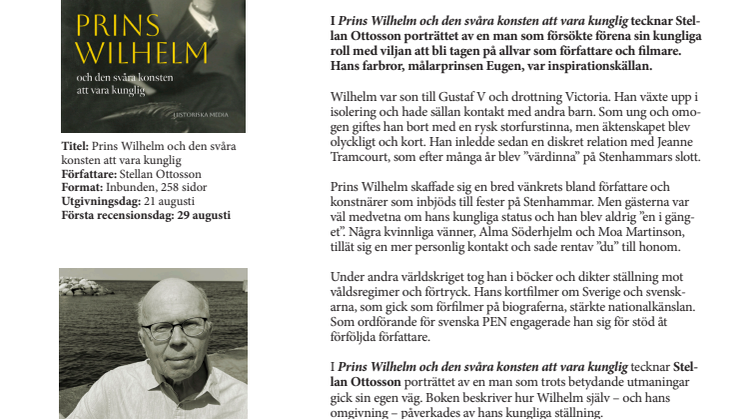 I Prins Wilhelm och den svåra konsten att vara kunglig tecknar Stellan Ottosson porträttet av en man som försökte förena sin kungliga roll med viljan att bli tagen på allvar som författare och filmare. Hans farbror, målarprinsen Eugen, var inspirationskällan.