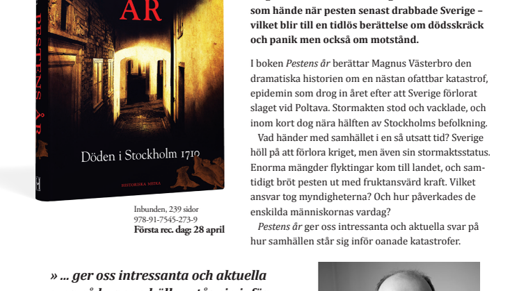 I boken Pestens år berättar Magnus Västerbro den dramatiska historien om en nästan ofattbar katastrof, epidemin som drog in året efter att Sverige förlorat slaget vid Poltava. Stormakten stod och vacklade, och inom kort dog nära hälften av Stockholms befolkning.