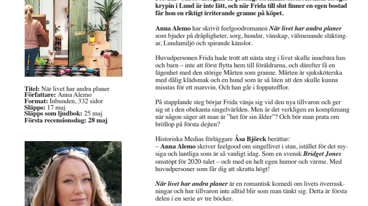 Anna Alemo har skrivit feelgoodromanen När livet har andra planer som bjuder på dråpligheter, sorg, hundar, vänskap, välmenande släktingar, Lundamiljö och spirande känslor.